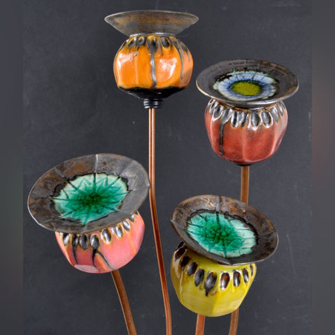Anja Penger-Onyett’s ceramic work is rooted in a deep reverence for nature, drawing inspiration from the forms and structures she finds in flowers, seed-heads, and the natural world. She works primarily with thrown and sculpted clay, using these techniques to create intricate pieces that blur the line between functional ceramics and sculpture. One of Anja’s signature elements is her focus on recognizable forms, such as the distinctive crowns of poppy seed heads, which she emphasizes with the vibrant addition of glass frits at the centre of each piece. Anja’s more recent work explores a "painterly" approach to surface decoration, using slips, engobe, and ceramic crayons to bring her slab-built vases and altered pieces to life with intricate colour and texture. Working with white stoneware clay, she is able to fire her pieces at high temperatures, resulting in rich glazes that emerge with clarity and depth. This technique also ensures that her works are frost-proof and suitable for outdoor display, allowing nature to be part of the artwork’s ongoing journey. Anja is an avid experimenter, continuously mixing her own glazes from raw materials to create new, evocative colours that echo her love of nature and the landscapes she has explored.